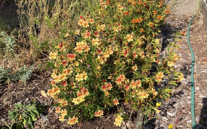 The orange, tubular flowers of sticky monkey flower can be enjoyed in many locations throughout Sonoma and Marin counties in spring and summer, a testament to how well this plant is adapted to hot and dry conditions. The slightly sticky leaves benefit from light pinching and pruning to maintain an attractive appearance and support for the beautiful flowers. Many hybrids provide color variation. Do not confuse this plant with the red-flowered scarlet monkey flower (Mimulus cardinalis), an herbaceous riparian plant that requires regular water to thrive.
