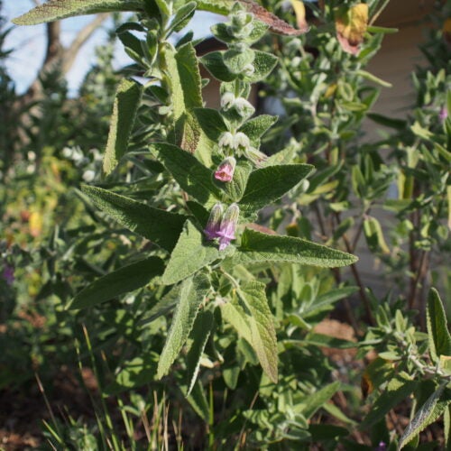 Evergreen shrub quickly reaches 3-6 feet tall and wide, with aromatic, softly hairy, gray-green leaves and pinkish to lavender tubular flowers in spring and summer. Native to rocky, often north-facing slopes in the mountains of central and southern California, the Channel Islands, and Baja California. Full sun along the coast, light shade inland, most well-drained soils. It attracts hummingbirds and hosts two species of moth and butterfly.