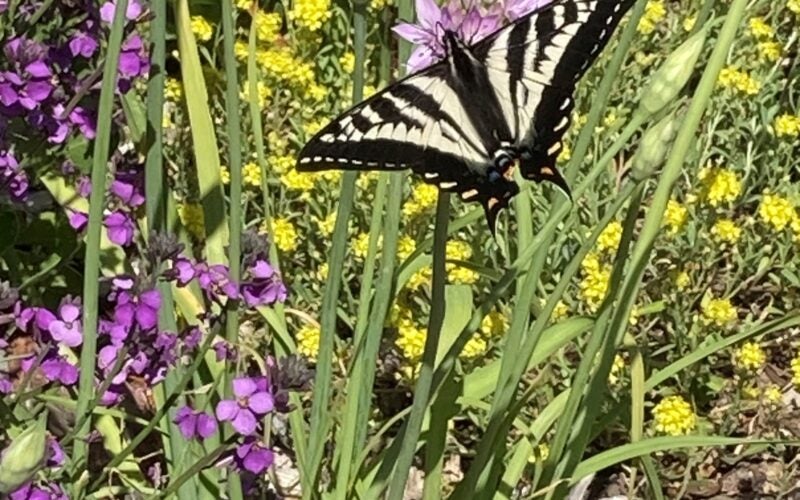 The front of the house is dominated by a huge heritage Coast Live Oak (Quercus agrifolia). Enter through the east side gate and you will soon be in a beautiful habitat garden. Birds, bees and butterflies abound. The pipevine swallowtail is the main butterfly, but the anise swallowtail is often seen nectaring on the Erysimum ‘Bowles Mauve’. Anna’s hummingbirds and the little titmouse are attracted by the feeders that I put out for them.
